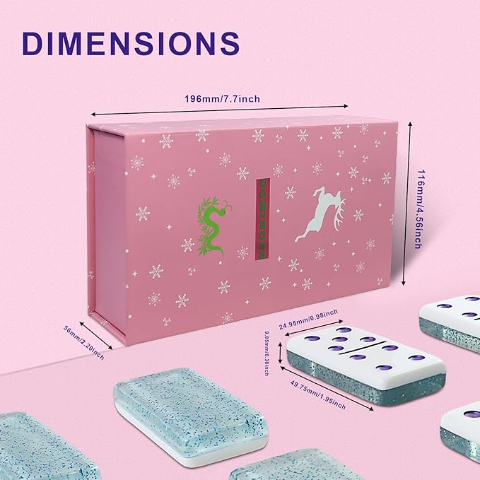 • [PRODUCT DETAILS] : Domino set of 28 pieces, is a classic acrylic board games domino, Excellent quality and reasonable price. And matched With Gift Box and 7 Polyhedral Dice, Each domino size: 1.95*0.98*38 inches ( 28pcs domino wooden box 7.7*4.56*2.2 inches ).
