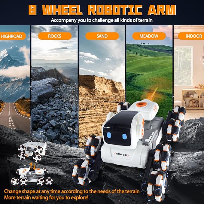 - All-Terrain Capabilities: Equipped with eight wheels and powerful swinging arms, the robot dog can navigate various terrains like grass, deserts, rocks, stairs, and rough roads, providing an exceptional outdoor experience