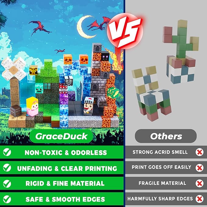 - 【Dark Hell Forest Castle Magnetic Cube Kit】Including 150 Magnetic cubes in 26 colors. Idea booklet with the storyline and beautiful patterns, keep them busy in clever ways. GraceDuck magnetic activity cubes are made of high-quality ABS material and crafted with round edges and the right size. Unlike other Magnetic toys on the market, our magnetic cubes kit with super strong internal Magnetic, which is easier for toddlers ages 3+ to stick the cubes together and make builds sturdy. Perfect STEM toys help kids gain a deeper understanding of the structure and learn about magnetic properties!