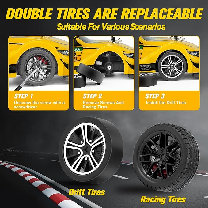 - MULTI-FUNCTIONAL TOY REMOTE CONTROL CAR: Equipped with multiple tire types, the rc cars drift features detachable 4 racing tires and 4 Drift tires, allowing you to experience the fun of racing and drifting with just one car. Both types of tires are detachable and replaceable, convenient for use in various locations. Enhancing the product's appeal and playability, the front of this drift remote control car features bright LED lights, making it more attractive and realistic for night driving.