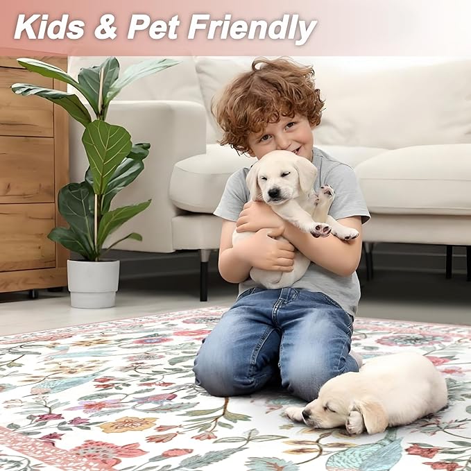 - Soft Floral Area Rug: The soft pink flowers paired with graceful birds create a vibrant, yet delicate design that brings a cheerful vibe. The dense faux wool surface so soft that feels like walking on clouds, which creates a cozy area for children to play and rest