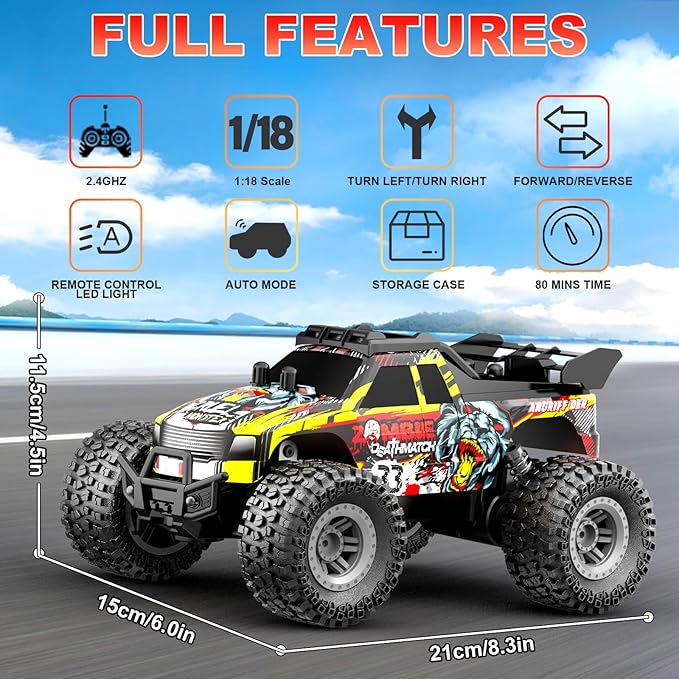 - 【RC Monster Truck Racing 80+ mins】Bring the car outside to explore and racing on the same highway with friends,2.4Ghz remote control without radio interference ,race up to 6 trucks at a time!