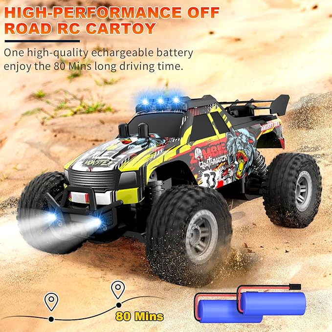 Remote Control Car for Kids Ages 6-12, High-Speed 2.4GHz Monster Truck with Flash LED Lights & Two Rechargeable Batteries – 80 Min Playtime, Off-Road Adventure Toy for Boys & Girls