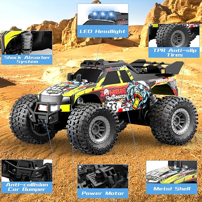 - 【Explore Off-Road RC Truck】Powerful torque to move on any terrain easily and stably. And 4 huge size anti-slip TPR tires alleviate the impact of this remote control car effectively when driving. They are not easy to crack and allow you to drive the RC cars for boys age 6+ in all terrains like grassland, sand, rock, carpet, hardwood, hill, desert, gravel, cement pavement or asphalt pavement.