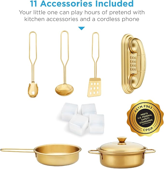 • 11 ACCESSORIES INCLUDED: Set includes 3 utensils, 2 pots, 1 lid and kitchen comes with an ice maker that dispenses 4 ice cubes, and cordless phone; keep the accessories in the overhead shelf, the oven, in the fridge, freezer, microwave, or dishwasher