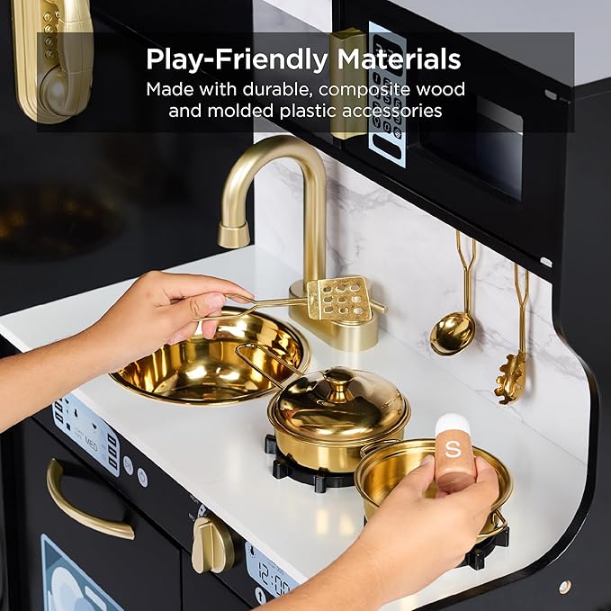 • TRUE TO LIFE KITCHEN: Your child can get a true experience with features like a towel rack and ice machine, and realistic sounds like the "click" of the oven knobs as they pretend to bake and cook in a designer kitchen with a modern backsplash
