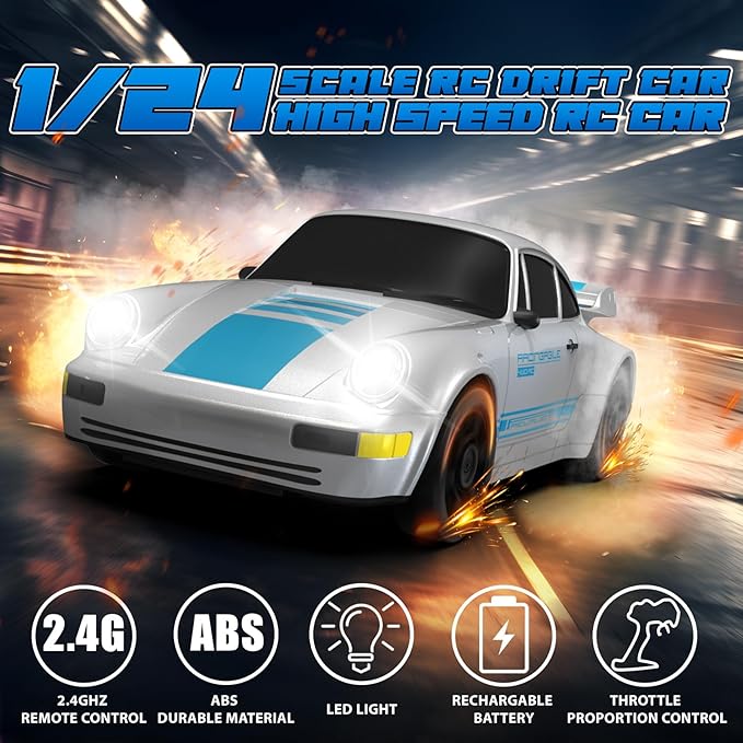 - 1:24 SCALE RC DRIFT CAR: This RC drift car features a sturdy, high-quality hard shell to resist collisions. Drift rc car can move forward, backward, left, and right turns, with exceptional drifting capabilities. Throttle proportional acceleration allows advanced drifts like U-shaped, circular, side azimuth, and 360° spins. With a top speed of 15 KM/H, it delivers an exhilarating racing experience. Cool LED lights on the front make night driving more exciting. Perfect for kids and adults, this mini drift car is fun and easy to handle!