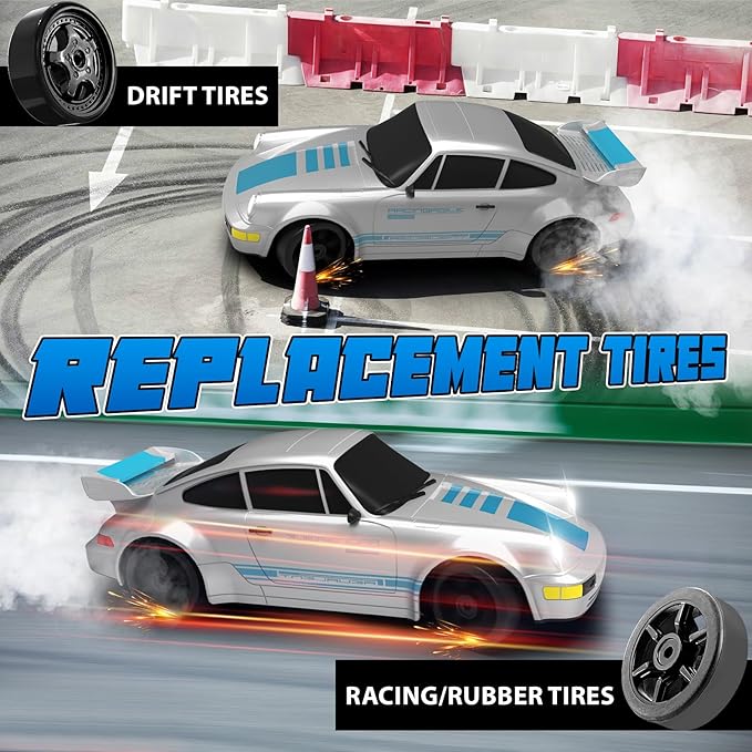 - REPLACEABLE TIRES: This drifting rc car toy includes two sets of interchangeable tires: 4 rubber racing tires and 4 drift tires. The drift tires are perfect for smooth surfaces and track drifting, while the rubber tires provide excellent grip for speed and racing on good road conditions. Switching between tires is quick and easy, letting you seamlessly enjoy both drifting and high-speed racing fun.