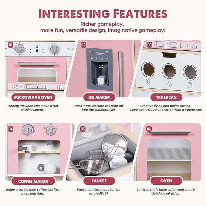 - ๐Safety And Durability Guaranteed: Our wooden toy kitchen set is made of high-quality, child-safe materials and meets US ASTM F963 and CPSIA standards, ensuring a safe and durable play experience for your children. Our kitchen toy set adds an anti-tip design to ensure that the product will not tip over, protecting your child's safety at all times!