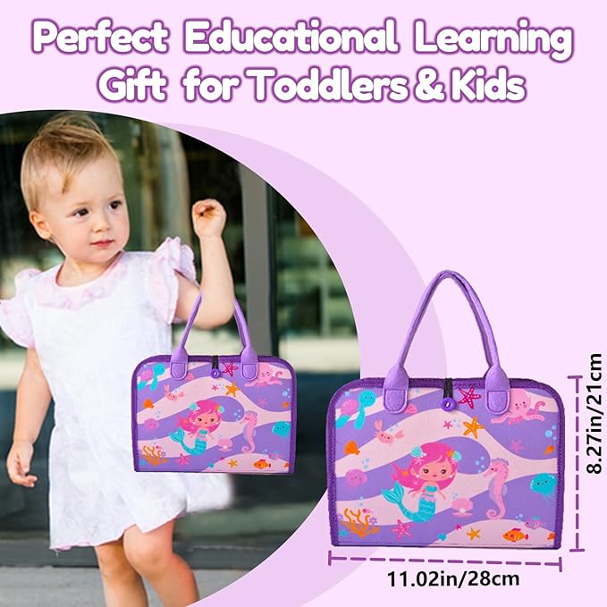 - Skills at Play: With 20+ engaging activities, our busy board helps toddlers develop essential skills, from fine motor control and problem-solving to dressing practice and hand-eye coordination. Includes zippers, gears, buttons, shoelaces, alphabet, numbers, clocks, and sensory games for endless engagement. The charming mermaid design adds a magical touch, perfect for girls and making it a must-have educational toy for toddlers 1-3 and kids 2-4