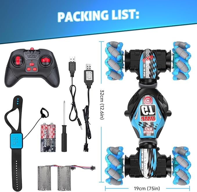 - 【The Coolest Gift】: If you are looking for fun and engaging toys for your boys or girls 8 9 10 11 12 13 14 15 years old, I highly recommend this RC stunt car. The set contains a RC car, a gesture sensing control, a remote control, 2 rechargeable batteries, 2 USB charger, 2 AA batteries and a screwdriver.We can supply refund service or replace a new car within 30 days, and a 1-year warranty since you purchase the device.