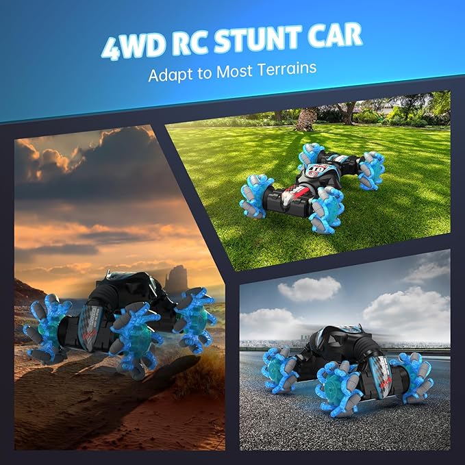 - 【4WD All-Round Drift】: This RC stunt car is equipped with advanced mecanum tires, rotate in 360 degrees, can drift in all directions, including left/right/diagonal drift, flexible to walk by sideways. The flexible wheels and twistable joint allow for experiencing higher speeds and better agility. Fits for indoor and outdoor like sandy beach, wetlands, grasslands, etc.