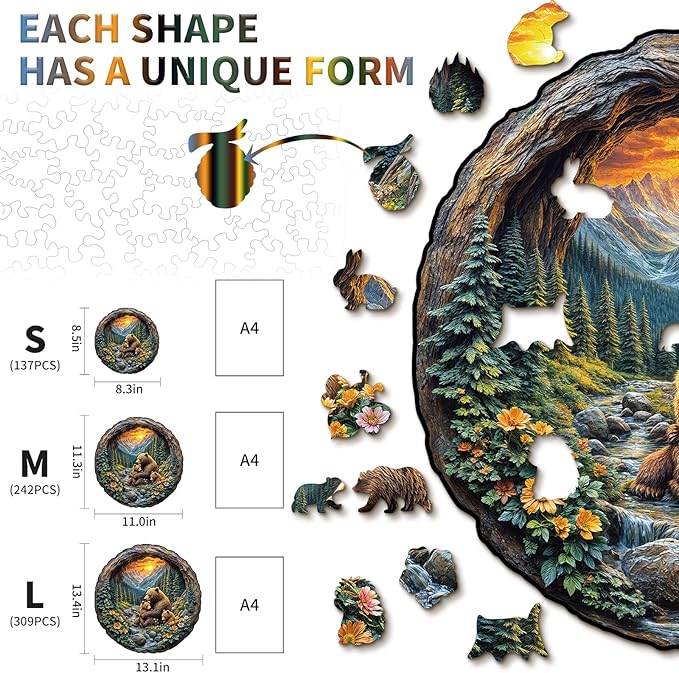 - Realistic 3D Visuals Brown Bear: this 3D visual wooden puzzle showcases a heartwarming scene of a brown bear family in a forest at sunset. The brown bears, with their thick, soft - looking fur, and their endearing expressions and gentle postures are vividly detailed. The setting sun casts a warm, golden yellow glow over the entire scene, painting the bears, forest, and sky in harmonious colors, creating an immersive and heartwarming visual experience
