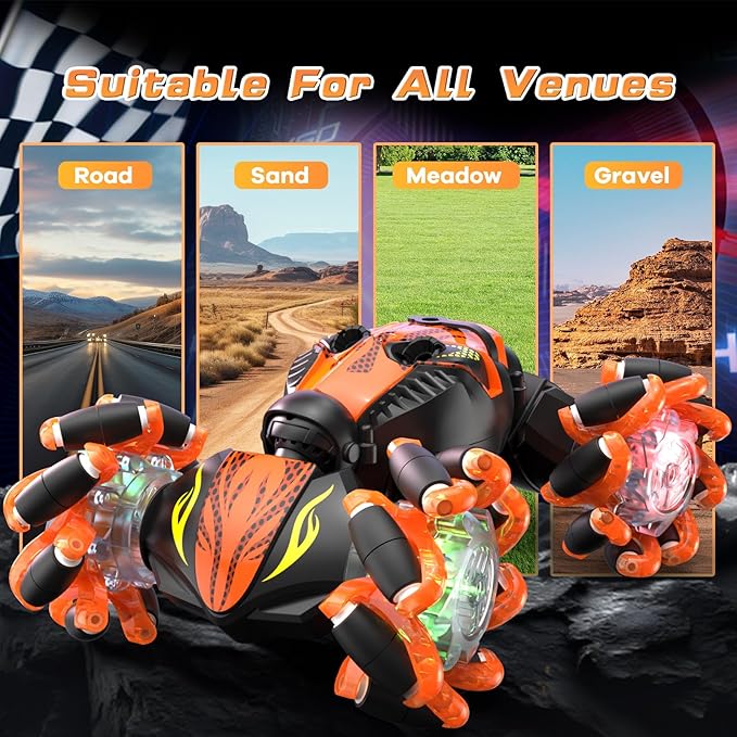 - 🏎️【Wear-resistant & Safe Tires】The gesture sensing RC stunt car uses the popular Mecanum tires. The wheels of the remote control stunt car will unfold during driving. The gesture-sensing remote control stunt car toy supports operation in multiple scenes, such as grass, sand, and rocky roads. Whether it is a boy or a girl, the drift stunt remote control car is extremely safe and playable