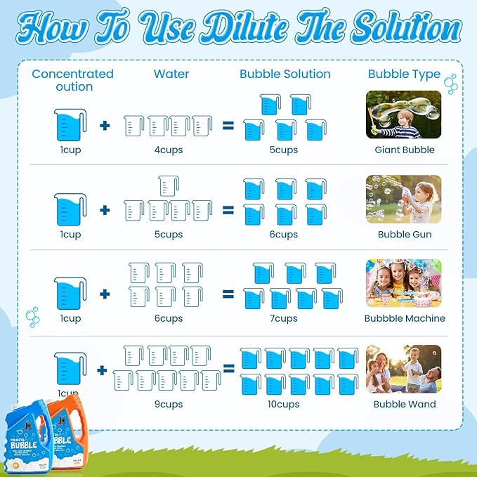 - EASY TO MIX & USE: Achieve the perfect bubble experience effortlessly. Mix 1 part solution with 10 parts water for regular bubbles or 1 part solution with 5 parts water for giant bubbles. Clear mixing instructions are included for convenience.