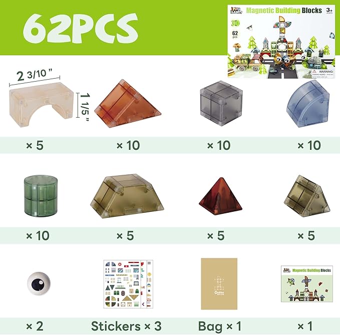 - 【62Pcs Magnetic Building Blocks】:There are including 8 kinds of 3D magnetic blocks, Such as cylinder, cube, arch, cone, etc. These magnetic blocks can not only be put together into numbers, letters, buildings. A pair of cute eyes also can create a lot of animal shapes. Three stickers also adds interest to the building blocks. Having it equals having endless fun.