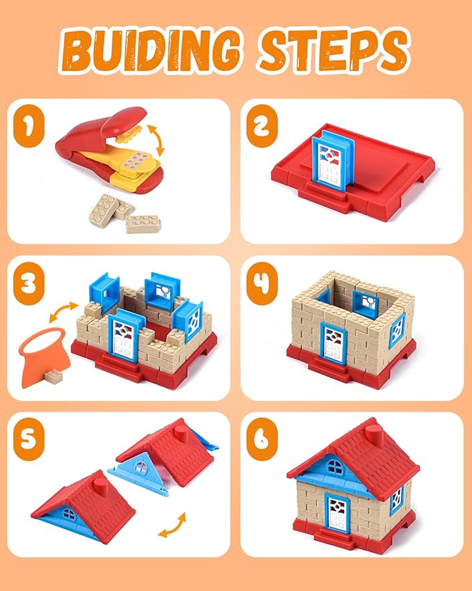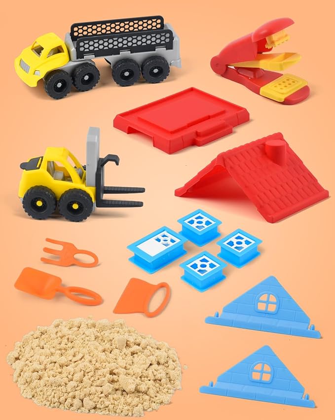 - 【Sand Construction Kit】This fun and engaging sand construction kit will keep your child entertained for hours! The kit includes 1.55 lbs moldable sensory sand,1 base, 1 roof, 1 brick maker, 1 hand shovel, 1 hand trowel, 1 door, 3 windows, 1 brick cutter, 2 sensory sand packs, 2 roof trusses, and 2 construction truck toy cars.