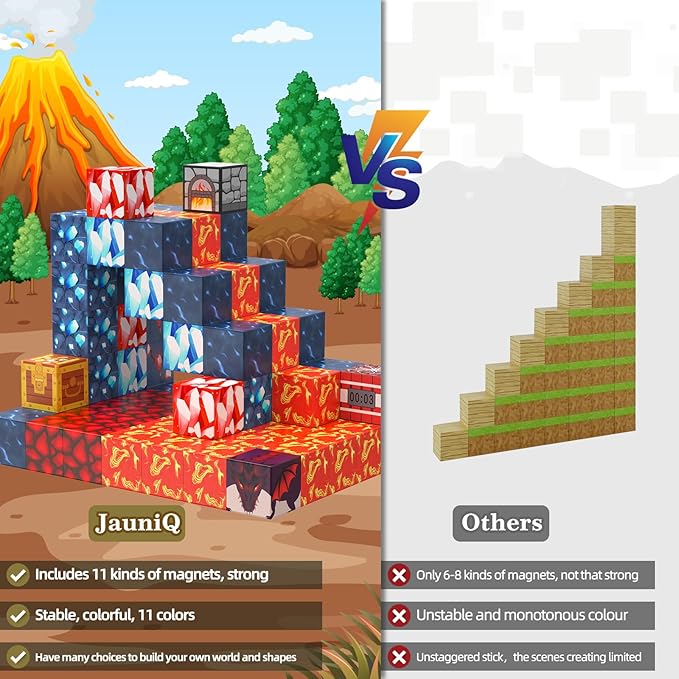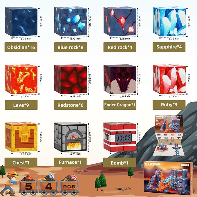 - Let's embark on an adventure with magnetic building blocks! : 100 pieces magnetic world set includes odsidian, blue rocks, lava, redstone, wooden box, furance, red rocks, sapphire, ender dragon, ruby, bomb. These magnet blocks encourage open-ended play, allowing kids to construct, demolish, and rebuild as they please. Safe, durable, and designed for little hands, our magnetic cubes make learning fun, enhancing focus, patience, and motor skills.