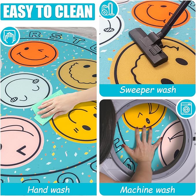 - This alphabet rug Made from upgraded materials has a soft, luxurious pile with well-stitched edges that are lint-free, odorless and skin-friendly. The innovative interactive seating design features a variety of emojis for a fun and innovative way to teach. Families can also play games on the game carpet, which can promote the close relationship between parents and children