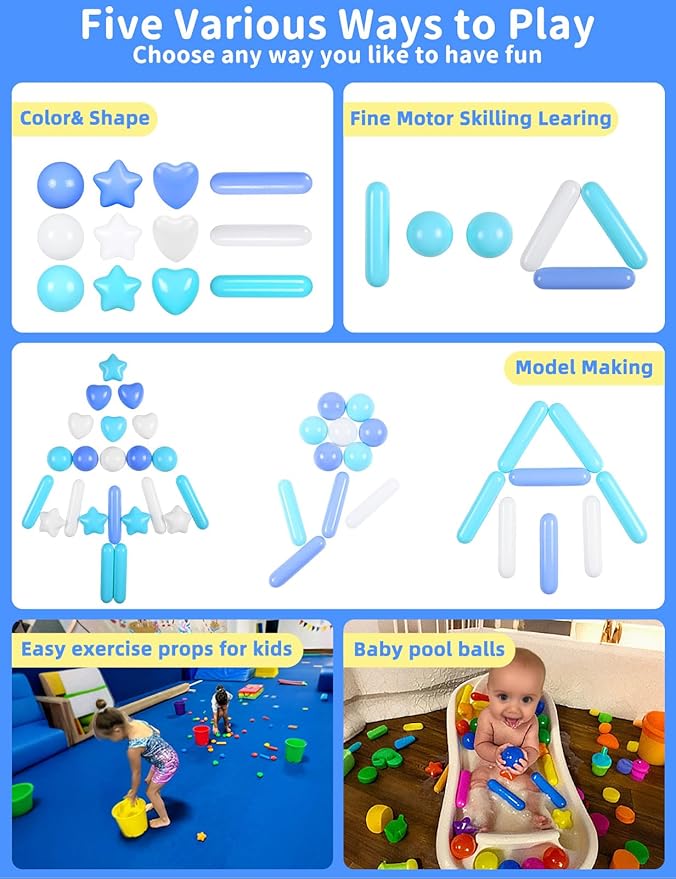 - MULTIPLE SHAPES : stars,balls, candy balls, The lastest color combinations, very suitable to match the girl boy ball pit, theme party, playground at home, clean, bright color combination will be ideal for wedding decoration or photo background. Fall-resistant and inflatable plastic balls can survive any child abuse!