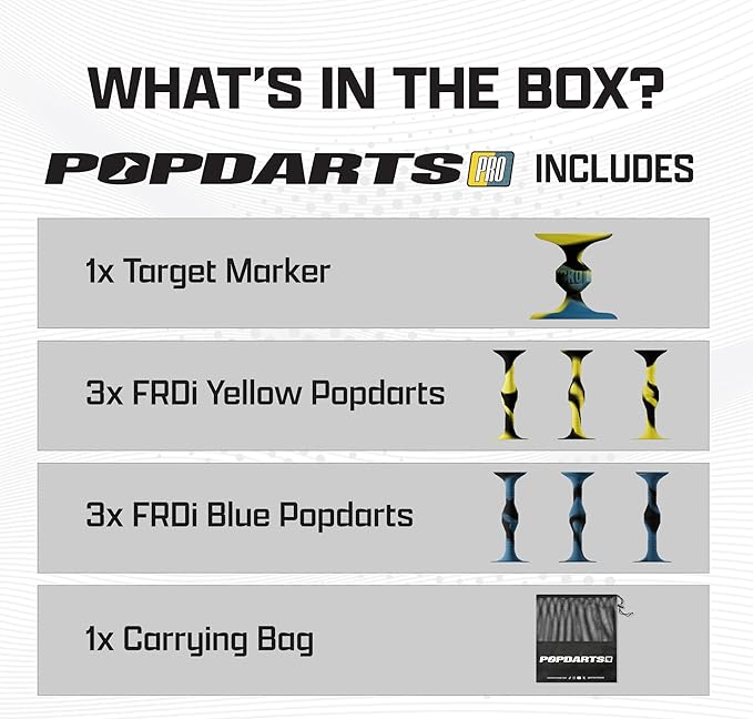 • WHAT’S INCLUDED IN A SET? 3 Black/Blue Swirled Popdarts | 3 Black/Yellow Swirled Popdarts | 1 Black/Yellow/Blue Target Marker | 4 Mesh Carrying Bag with rules printed right on the bag