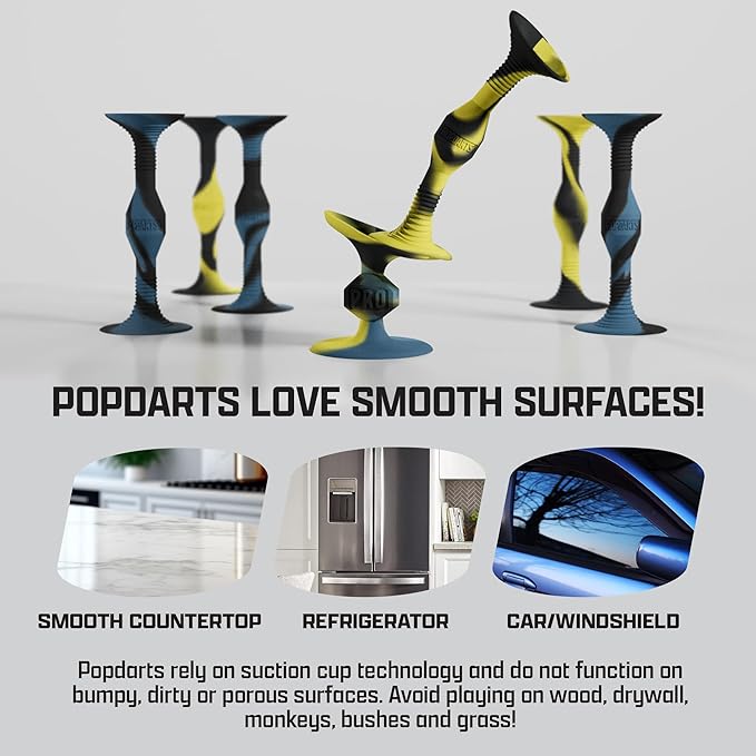 • WHERE CAN I PLAY? Our compact sets can be played wherever you go, indoors or outdoors. Popdarts stick best to smooth surfaces like a countertop, refrigerator, window, car windshield, glass door, surfboard – be creative!