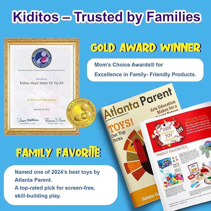 - Interactive Creative Play:Ideal for parent-child interaction, children's parties, and holiday gifts, the Magic Water Elf enriches family time and adds fun to play sessions. We offer a high-quality warranty and are always available at Kiditos for any questions you might have.