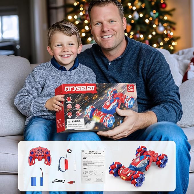 - 【All-Terrain Drifting Race】 360 rc cars for boys age 6-12 operates on a 2.4GHz anti-interference system, ensuring smooth and uninterrupted control. Parents and kids can enjoy an exhilarating stunt show together, enhancing parent-child bonding. The bionic joints design of Qryselen remote control car allow it to conquer gravel lawns beaches stairs and carpets. The drifting stunt car can transform from road mode to off-road mode within seconds and can even climb up some slopes.