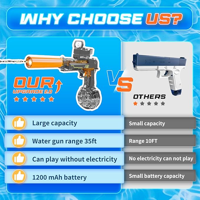 • Extended Water Game: Our squirter boasts a high-capacity 1200MAH battery for 45 minutes of playtime and easy swaps. A large 500ML reservoir refills with a fast 25-second refill time, Soaking Fun