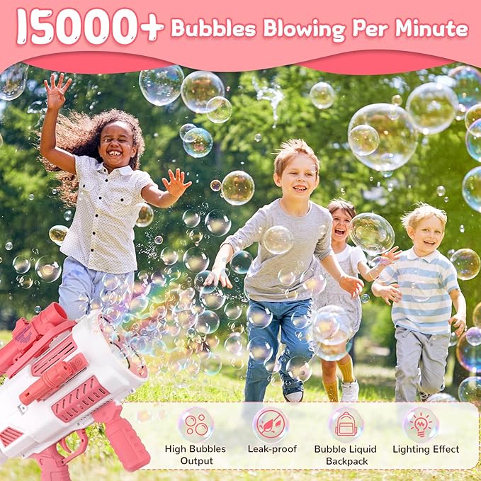 Bubble Gun, Upgrade Gatling Bubble Machine Gun Portable Bubble Maker with Backpack, Anti-Leakage Bubble Blower Gun Gifts for Boys Girls Age 3 4 5 6 7 8 9 10 11 12 Years Old (Pink)