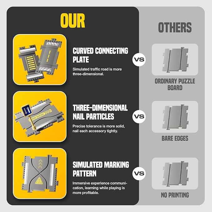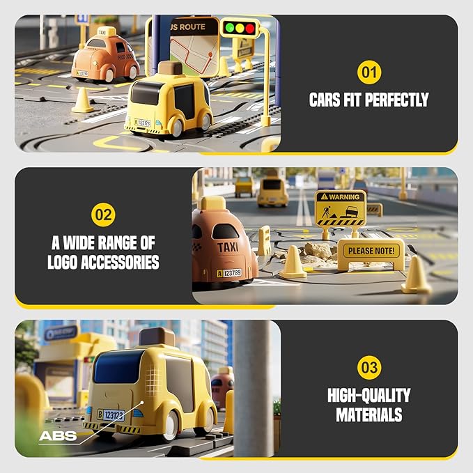 - 【Next-Gen Puzzle Track System】Upgraded interlocking pieces feature curved connectors for 3D elevated roadways and precision-molded grip studs that click securely with satisfying "snap" sounds. Realistic lane markings and roadside textures create immersive cityscape, while our design (0.1mm tolerance) ensures wobble-free stability. Includes 2 smooth-rolling turbo cars (Requires 2 AAA batteries, not included)