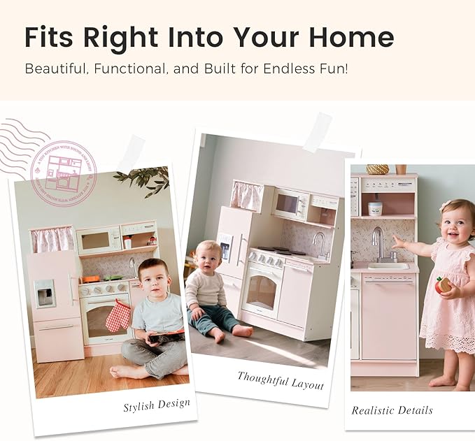 • Upgraded Design for Realistic Role Play: This enhanced wooden kitchen set features a well-organized layout with play zones for cooking, cleaning, baking, and a pretend coffee station. Perfect for little chefs to explore real-life kitchen fun!