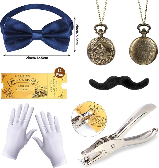 • Complete Conductor Outfit: This fun and detailed children train conductor costume includes a vest,hat,whistle,glasses,pocket watch,beard,gloves,bowtie,hole punch,and 12 conductor tickets for a fully immersive experience