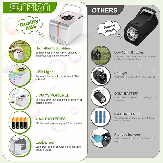 - Enhanced LED Bubble Fun - The 2025 Ednzion bubble machine now comes in a sleek silver design with vibrant LED lights, perfect for day or night play. It produces over 20,000 bubbles per minute with an upgraded waterproof motor, ensuring stable performance and longer durability. (Note: If bubbles aren’t blowing, check the power supply or replace the batteries.)