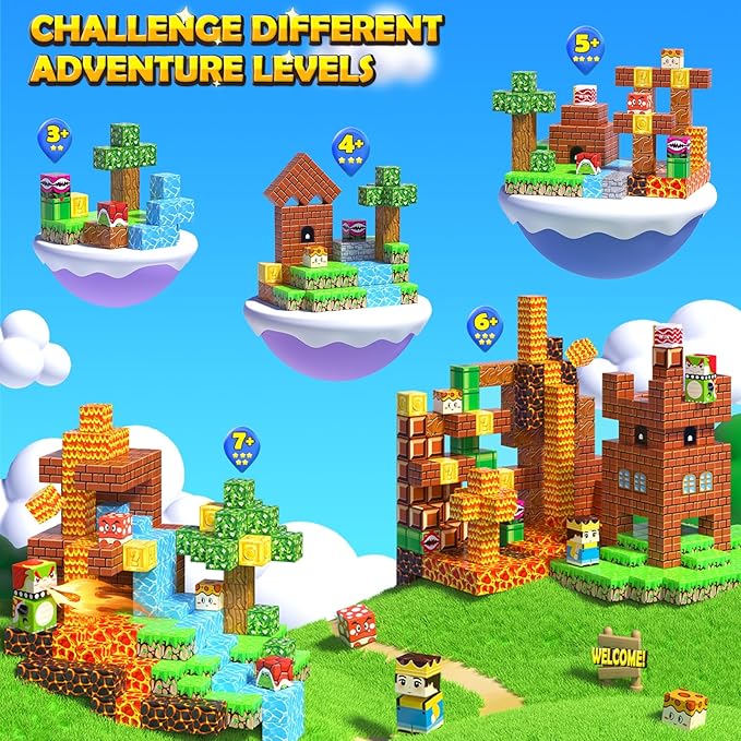 - 【100PCS MAGNETIC BLOCKS CUBES】Designed for kids who love creative building and adventure, feature multiple elements like grass, coin blocks, rock blocks, water blocks, and lava, kids can construct their dynamic game levels that bring the popular video game to life making it a great gift for boys and girls