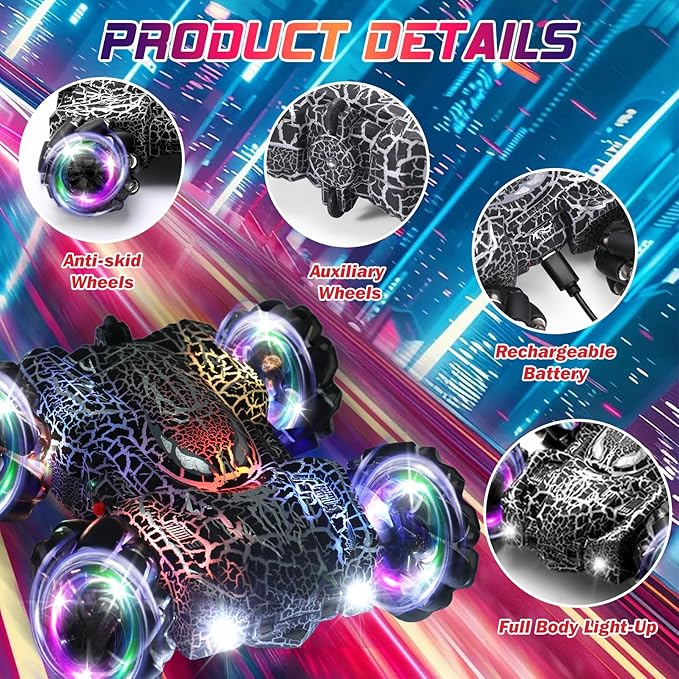 • 2 Control Modes RC Car: This 4-wheel RC stunt car is equipped with cool whole body LED lights and headlights. It can drift to all directions and flip, can easily complete double-sided driving stunts and 360° rotations