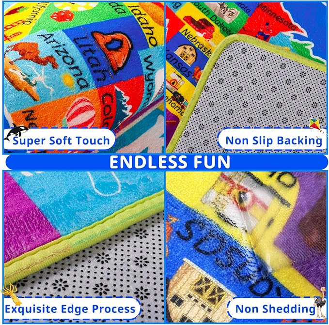 USA Map ABC Kid Rug for Playroom 78.7"×59" Classroom Play Rug Educational Baby Playmat Alphabet Rug State Symbols, ABC Letters, Numbers, Seasons&Shapes Fluffy Ployester Non-Slip Preschool Nursery Rug