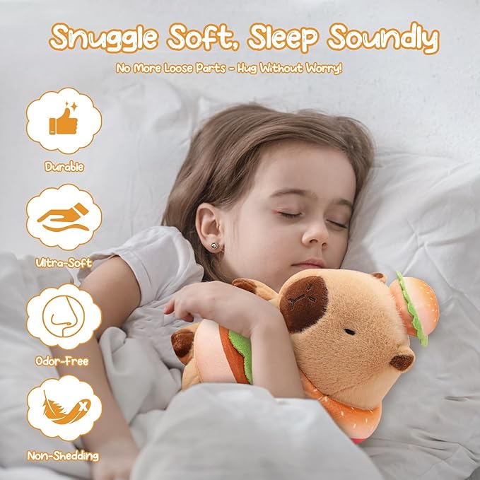 • Adorably Dressed Like a Burger: This chubby little Capybara plush comes dressed as a hamburger—complete with a plush sesame bun hat, lettuce ruffles, and a fluffy patty belly. So cute, quirky, and cuddle-ready