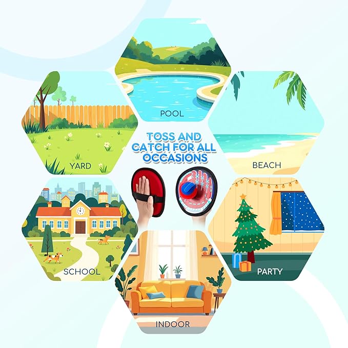 - ๐๐ผ๐ฟ ๐๐น๐น ๐๐ด๐ฒ๐ & ๐๐น๐น ๐ข๐ฐ๐ฐ๐ฎ๐๐ถ๐ผ๐ป๐ - With an adjustable strap, our set comfortably fits hands of all sizes, making it a perfect indoor and outdoor game for whole family. The ideal stickiness makes catching easy and peeling off effortless, keeping the fun going. Plus, the water-repellent, quick-dry fabric is great as pool toys, beach toys or yard games for whole family. With 4 paddles & 4 balls, itโs also a fantastic choice for party favors and playdates.