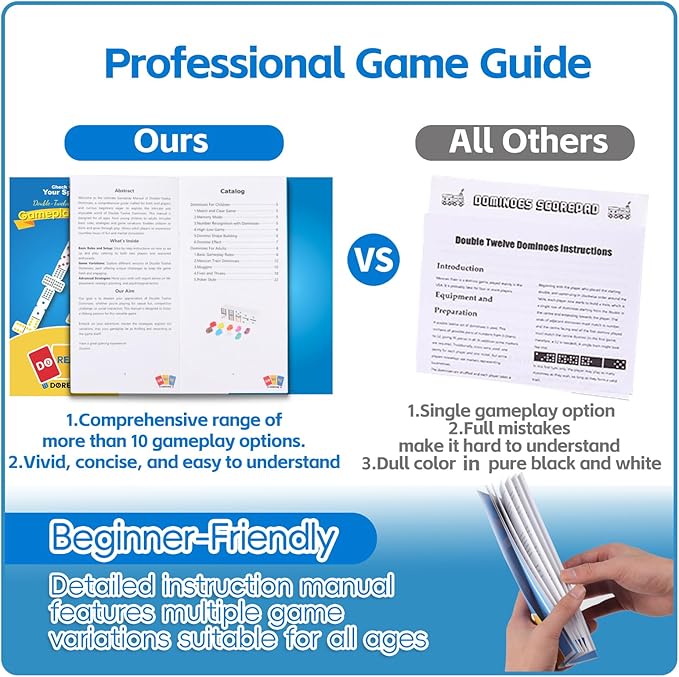 • Beginner-Friendly:Our Mexican train dominoes set includes Well-designed game manual to accommodate players of all ages and skill levels. With a variety of gameplay options clearly outlined, newcomers will find it easy to dive in, while experienced players can explore advanced strategies.