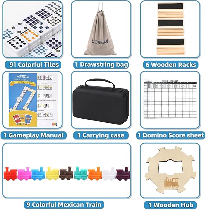 • 8 in 1 Mexican Dominoes Set: This dominoes Set is designed with 91 dot domino tiles, 6 wooden trays, 1 EVA case,1 drawstring bag, 9 trains, 1 game manual, 1 scorebook and 1 hub. The domino tiles are finely polished up to 5 times for shiny surfaces.