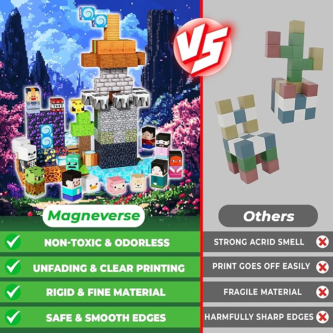 • 【Imaginaions & Creativity Builder】Let's embark on an adventure with building blocks! Spark the imagination of children with themes of lava, portal and forest. These blocks encourage open-ended play, allowing kids to construct, demolish, and rebuild as they please. Safe, durable, and designed for little hands, our cubes make learning fun, enhancing focus, patience, and motor skills—ideal toys for kids 3+ years old.