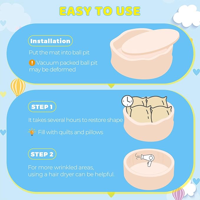 - 【Vacuum Seal Design】 The kiddie ball pit is vacuum-sealed. When you open the sponge, it will expand immediately, but it will not show a perfect circle immediately. It can be placed for 72 hours to wait for it to set. A hairdryer with moderate temperature or stuff the empty ball pit with pillows and blankets will help a lot to shape recovery