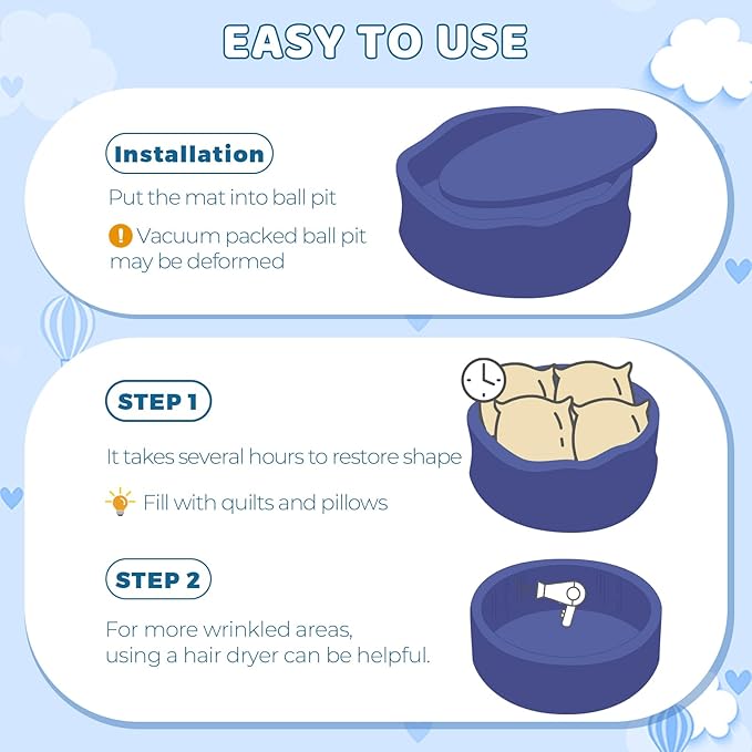 - 【Vacuum Seal Design】 The kiddie ball pit is vacuum-sealed. When you open the sponge, it will expand immediately, but it will not show a perfect circle immediately. It can be placed for 72 hours to wait for it to set. A hairdryer with moderate temperature or stuff the empty ball pit with pillows and blankets will help a lot to shape recovery