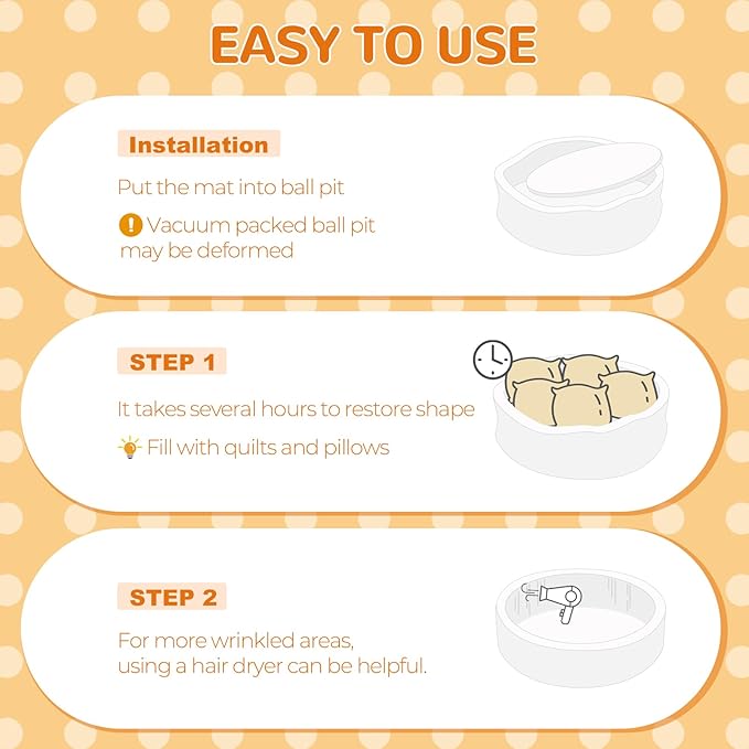 - 【Vacuum Seal Design】 The kiddie ball pit is vacuum-sealed. When you open the sponge, it will expand immediately, but it will not show a perfect circle immediately. It can be placed for 72 hours to wait for it to set. A hairdryer with moderate temperature or stuff the empty ball pit with pillows and blankets will help a lot to shape recovery