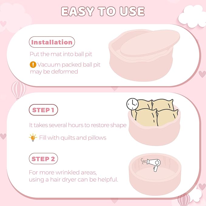 - 【Vacuum Seal Design】 The kiddie ball pit is vacuum-sealed. When you open the sponge, it will expand immediately, but it will not show a perfect circle immediately. It can be placed for 72 hours to wait for it to set. A hairdryer with moderate temperature or stuff the empty ball pit with pillows and blankets will help a lot to shape recovery