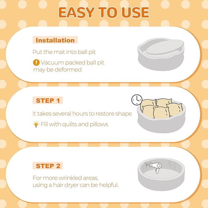 - 【Vacuum Seal Design】 The kiddie ball pit is vacuum-sealed. When you open the sponge, it will expand immediately, but it will not show a perfect circle immediately. It can be placed for 72 hours to wait for it to set. A hairdryer with moderate temperature or stuff the empty ball pit with pillows and blankets will help a lot to shape recovery
