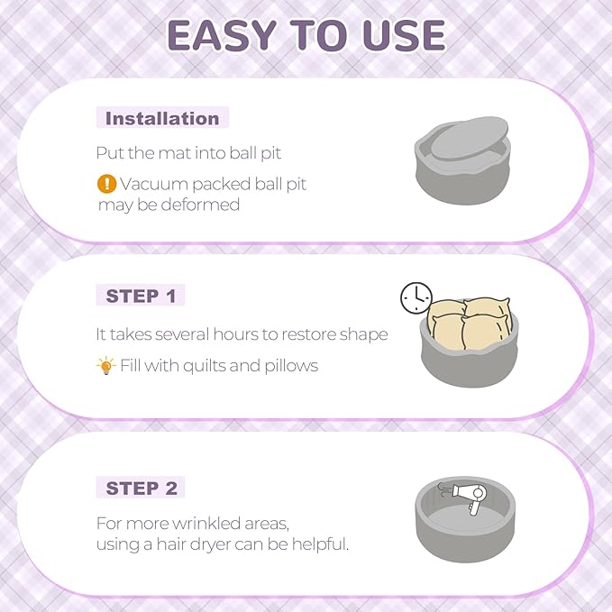 - 【Vacuum Seal Design】 The kiddie ball pit is vacuum-sealed. When you open the sponge, it will expand immediately, but it will not show a perfect circle immediately. It can be placed for 72 hours to wait for it to set. A hairdryer with moderate temperature or stuff the empty ball pit with pillows and blankets will help a lot to shape recovery