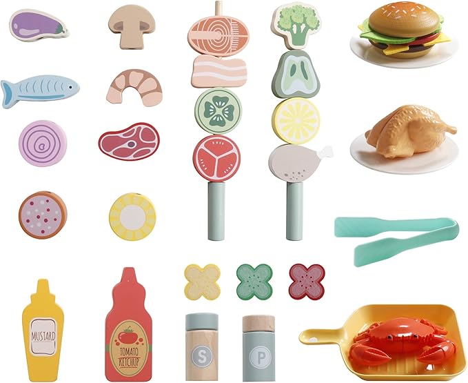 • Realistic toy food & utensil set​​ Prepare pretend meals with 32+ pieces: burger patties, veggie skewers, bread slices, and bottle-style ketchup/mustard dispensers. The textured food items (fish, meatballs, etc.) attach securely to wooden sticks.