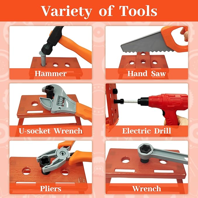 - Educational Pretend Tool Toys and Perfect Gift for Kids:More than just a toy for kids, this play tool set helps kids develop problem-solving skills, creativity, hand-eye coordination, and social interaction. Suitable for kids who love tools and love to build things. Christmas and birthday gift for boy or girl aged 3 4 5 6 7